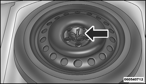 6. Remove the scissors jack and lug wrench from the spare wheel as an assembly. Turn the jack screw to the left to loosen the lug wrench, and remove the wrench from the jack assembly.