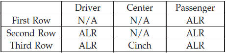 The seat belts in the passenger seating positions are equipped with an Automatic Locking Retractor (ALR) or a cinching latch plate which are used to secure a child restraint system. For additional information refer to “Installing Child Restraints Using the Vehicle Seat Belt” under the “Child Restraint” section. The chart below defines the type of feature for each seating position.
