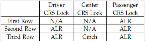 The seat belts in the passenger seating positions are equipped with an Automatic Locking Retractor (ALR) or a cinching latch plate to secure a Child Restraint System (CRS). These types of seat belts are designed to keep the lap portion of the seat belt tight around the child restraint so that it is not necessary to use a locking clip. The ALR will make a ratcheting noise if you extract the entire belt from the retractor and then allow the belt to retract into the retractor. For additional information on ALR, refer to “Automatic Locking Mode” description under “Seat Belts in Passenger Seating Positions” section. The chart below defines the seating positions with an Automatic Locking Retractor (ALR) or a cinching latch plate.