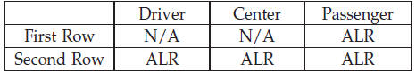 The seat belts in the passenger seating positions are equipped with Automatic Locking Retractors (ALR) which are used to secure a child restraint system. For additional information, refer to “Installing Child Restraints Using The Vehicle Seat Belt” under the “Child Restraints” section. The chart below defines the type of feature for each seating position.