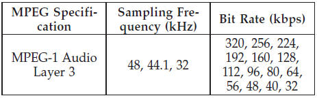 When using the MP3 encoder to compress audio data to an MP3 file, the bit rate and sampling frequencies in the following table are supported. In addition, variable bit rates (VBR) are also supported. The majority of MP3 files use a 44.1 kHz sampling rate and a 192, 160, 128, 96 or VBR bit rates.