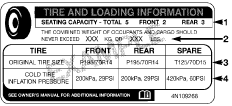 4) cold tire inflation pressures for the front, rear, and spare tires.