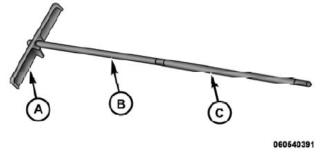 The tool pouch contains three pieces and can be assembled into a spare tire hook; to remove the compact spare tire/ cover assembly from under the vehicle, or aWinch T-handle; to raise/lower the compact spare tire/cover assembly.