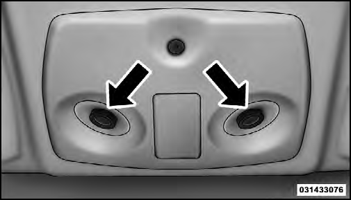 These lights are mounted between the sun visors above the rearview mirror. Each light can be turned on by pressing the barrel. Press the barrel a second time to turn the light off. Both of these lights can swivel so that the light can be aimed at a specific spot, if desired. The lights will remain on until the switch is pressed a second time, so be sure they have been turned off before leaving the vehicle. They will not turn off automatically. Interior lighting also comes on when a door is opened or the dimmer control is turned fully upward, past the second detent.