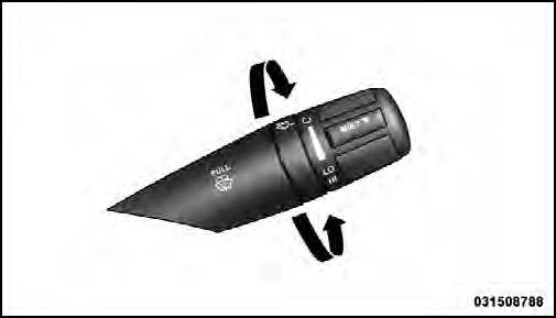 Use the intermittent wiper system when weather conditions make a single wiping cycle with a variable pause between cycles desirable. Rotate the end of the windshield wiper/washer control lever to the first detent, and then turn the end of the lever to select the desired delay interval. There are five delay settings, which allow you to regulate the wipe interval from a minimum of one cycle every second to a maximum of approximately 18 seconds between cycles.