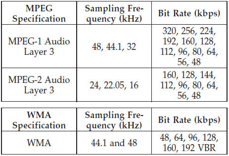 When using the MP3/WMA encoder to compress audio data to an MP3/WMA file, the bit rate and sampling frequencies in the following table are supported. In addition, variable bit rates (VBR) are also supported. The majority of MP3/WMAfiles use a 44.1 kHz sampling rate and a 192, 160, 128, 96 or VBR bit rates.
