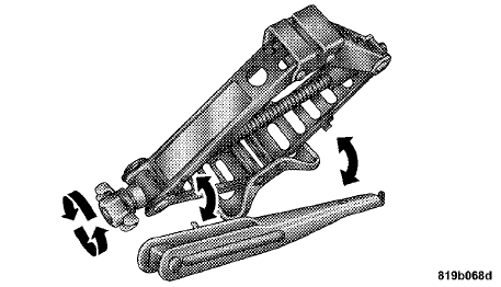 1. Remove the scissors jack and lug wrench from the spare wheel as an assembly. Turn the jack screw to the left to loosen the lug wrench, and remove the wrench from the jack assembly.