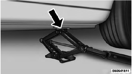 4. Turn the jack screw to the left until the jack can be placed under the jacking location. Once the jack is positioned, turn the jack screw to the right until the jack head is properly engaged with the lift area closest to the wheel to be changed. Do not raise the vehicle until you are sure the jack is securely engaged.