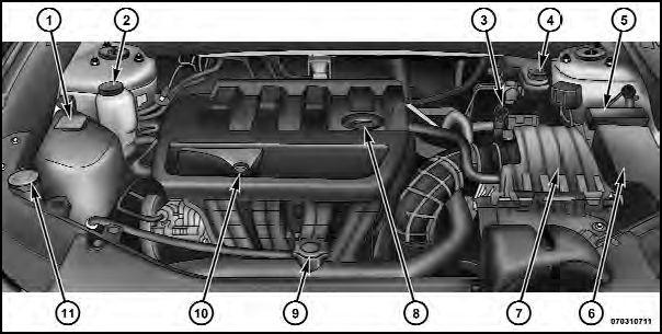 1 — Engine Coolant Reservoir 2 — Power Steering Fluid Reservoir 3 — Automatic Transmission Dipstick 4 — Brake Fluid Reservoir 5 — Integrated Power Module (Fuses) 6 — Power Distribution Center (Fuses) 7 — Air Cleaner Filter 8 — Engine Oil Fill 9 — Coolant Pressure Cap 10 — Engine Oil Dipstick 11 — Washer Fluid Reservoir