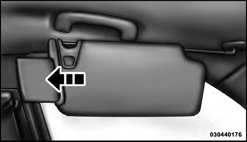 To use the “Slide-On-Rod” feature of the sun visor, rotate the sun visor downward and swing the sun visor so it is parallel to the side window, grabbing the sun visor with your left hand pull rearwards until the sun visor is in the desired position. To use the extender feature of the sun visor, grab the extender which is located at the rear of the visor and pull rearward.