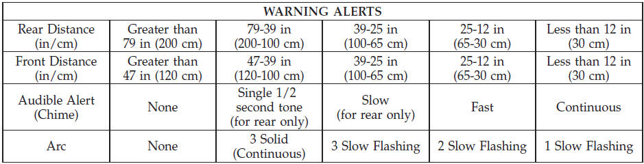 As the vehicle moves closer to the object the EVIC display will show fewer arcs and the sound tone will change from slow, to fast, to continuous.