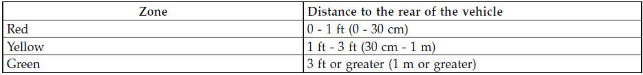 When displayed, static grid lines will illustrate the width of the vehicle while a dashed center-line will indicate the center of the vehicle to assist with parking or aligning to a hitch/receiver. The static grid lines will show separate zones that will help indicate the distance to the rear of the vehicle. The following table shows the approximate distances for each zone: